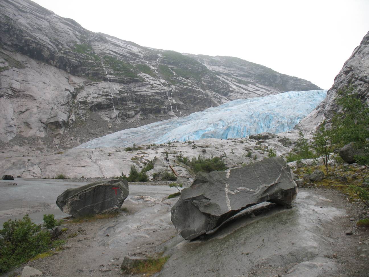 В 9-20 выезжаем в сторону стоянки у ледника Nigardsbreen (рукав огромного ледника Jostedalsbreen) и 10 -00 выходим к леднику. Решили, что туда прокатимся на моторке по ледниковому озеру Nigardsbrevatnet , дальше пешочком до кромки ледника. Начинается дождь, несильный, но очень противный. Правда, при такой погоде очень хорошо виден удивительный голубой лед ледника.