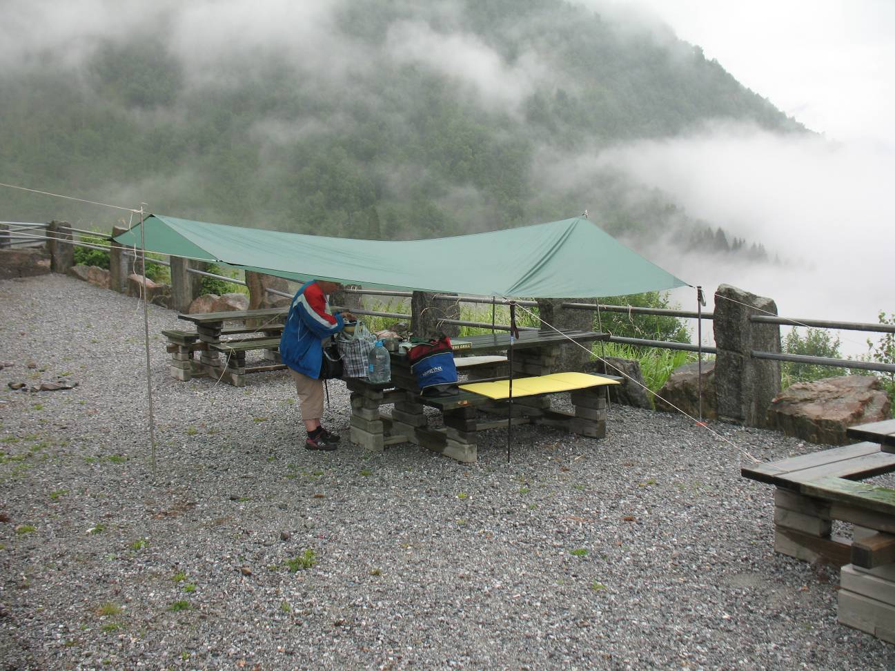 Моросит дождь. Мы натягиваем тент прямо над столом, жарим шашлыки, готовим суп.