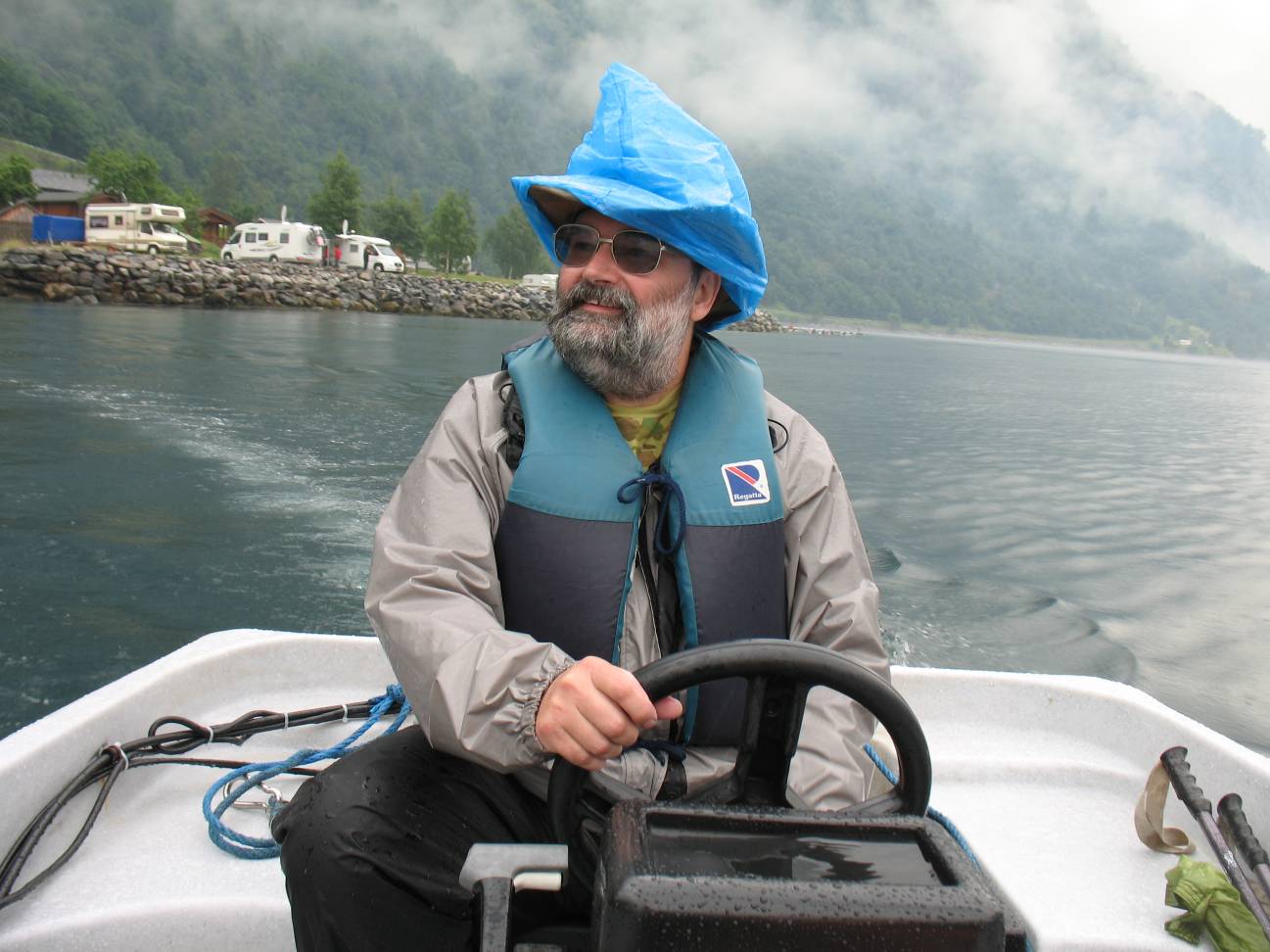 К 12 часам подъезжаем к кемпингу Grande Hytteutleige og Camping , где у нас заказано катание на лодке. Нас одевают по возможности в непромокаемую одежду, объясняют, как управляться с лодкой, и мы отплываем. Степанов за рулем (штурвалом) катера.