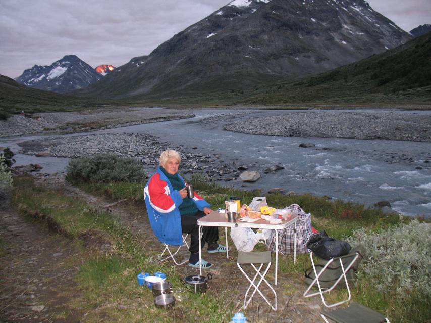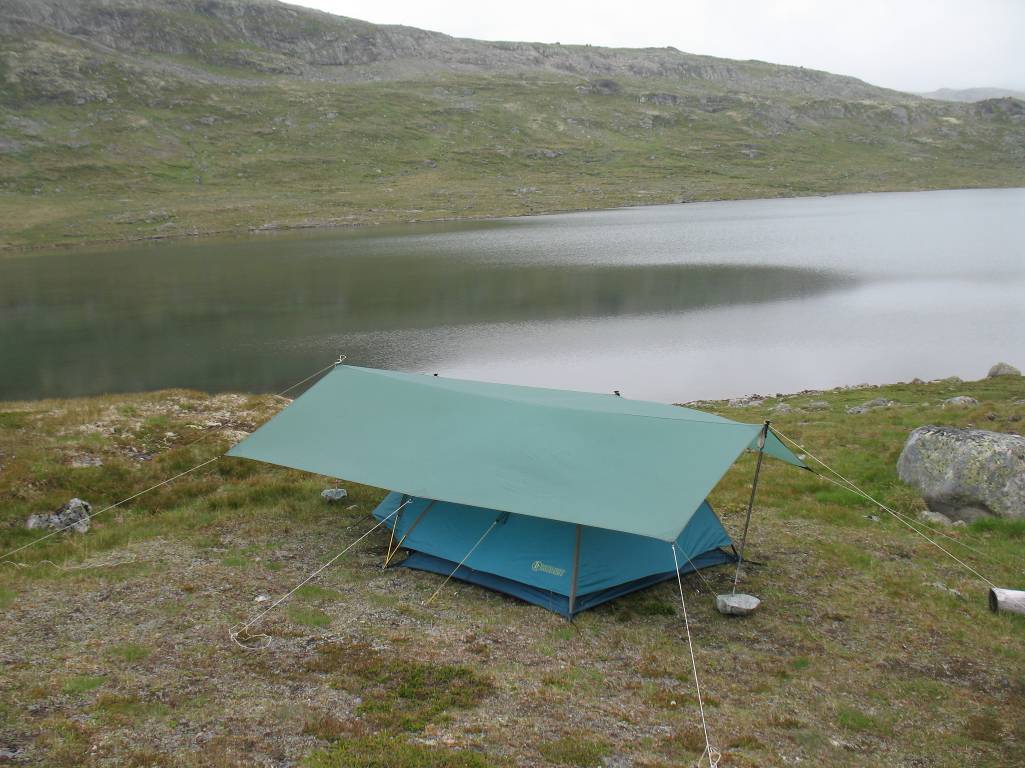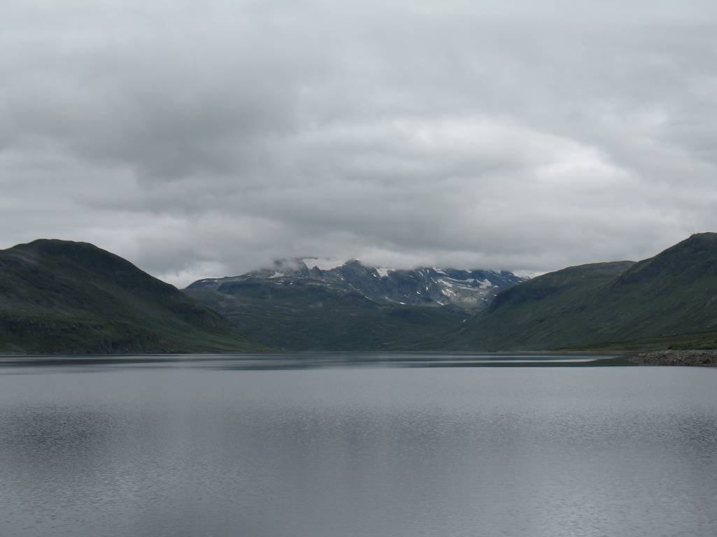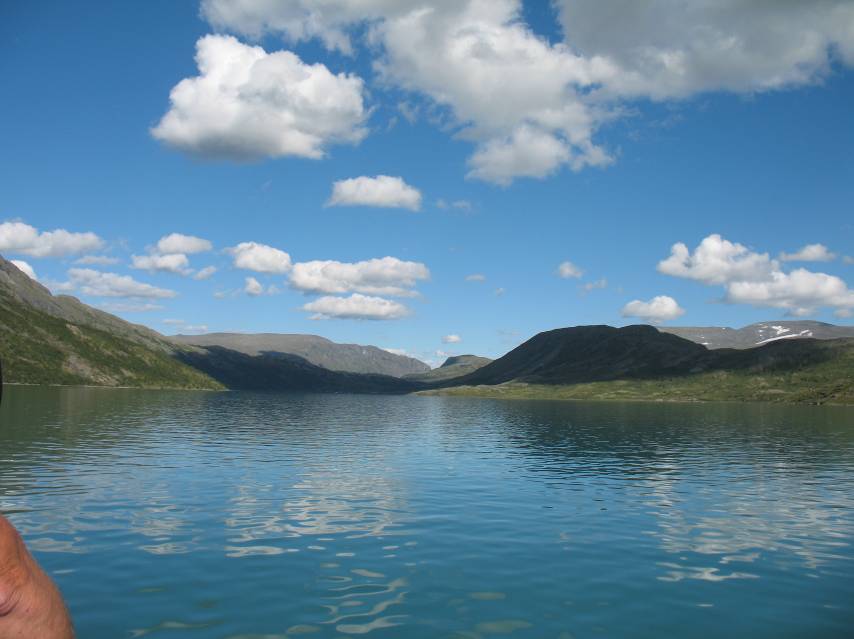В принципе, мы собирались сегодня попытаться дойти до Гьенде, и завтра сделать еще один маршрут в районе Гьенде с выходом на туристическую базу Memurubu. Но, когда мы вышли к озеру, мы поняли, что хотим здесь постоять лагерем. Народу – никого (на другой стороне озера стоит группа рыбаков, но до них очень далеко).Тропа проходит в стороне от озера, да и народ, похоже, в основном весь прошел. Тишина, покой, вокруг горные цепи, макушки затянуты облаками. Но встречные туристы (норвежцы) сказали, что на завтра хороший прогноз погоды, и есть шанс, что завтра мы увидим все это великолепие при солнечном освещении. Короче, в 17 часов встаем лагерем на берегу озера.