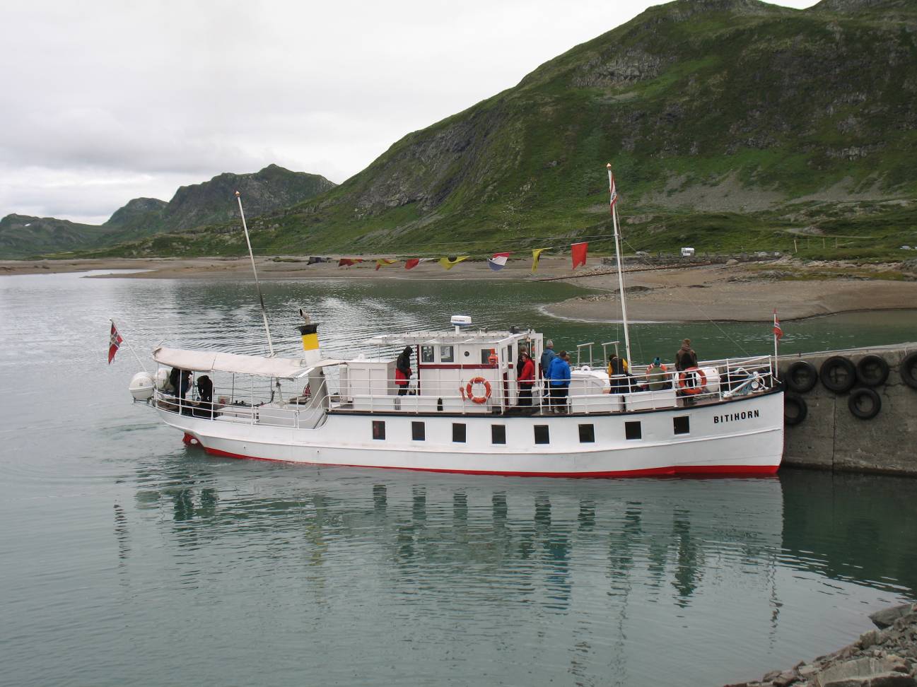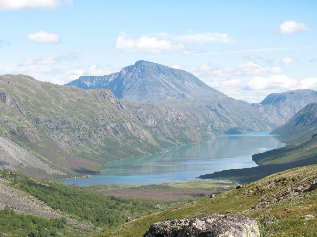 В 13 часов выходим на маршрут. Тропа, естественно, промаркирована.Сначала вдоль озера Бигдин, потом сначала полого, потом достаточно круто взбираемся наверх. Сверху видим, как наш любимый кораблик бежит по озеру с новой порцией туристов. Народ по тропе идет, но не в таких количествах, как на Гальхопиген. Это и понятно – троп тут полно во все стороны, и народ просто рассеивается по горам. Все друг с другом здороваются. Некоторые спрашивают, откуда мы.