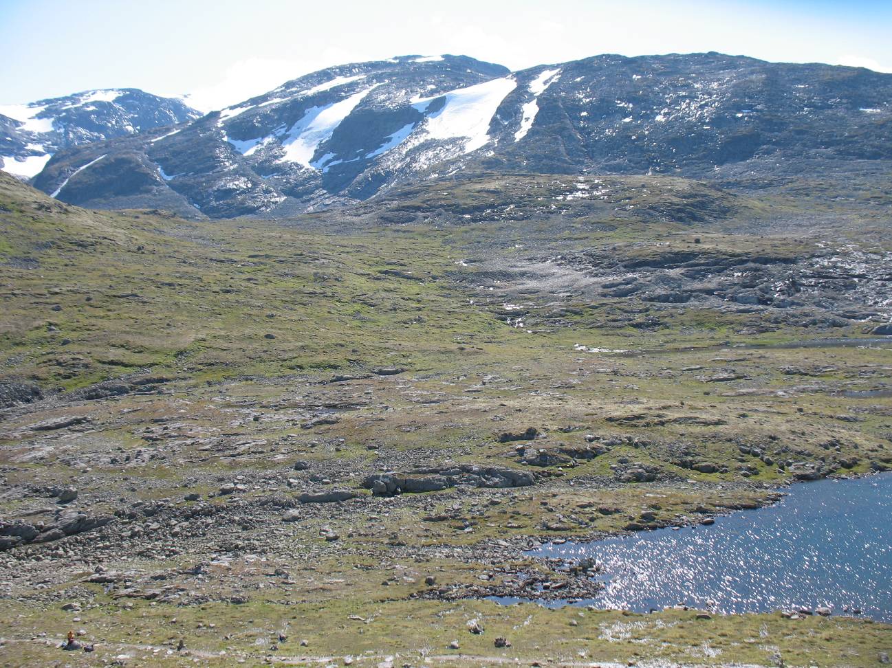 Переваливаем в сторону оз. Гьенде – открываются новые горизонты. Спускаемся по тропе к базе ДНТ Гьендебю (Gjendebu). Вокруг горки с небольшими ледниками, водопады.