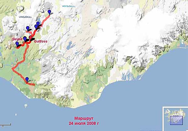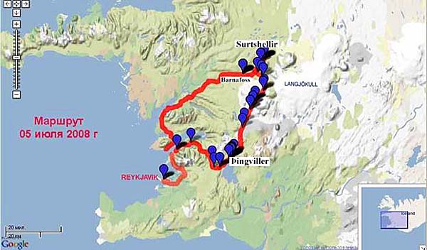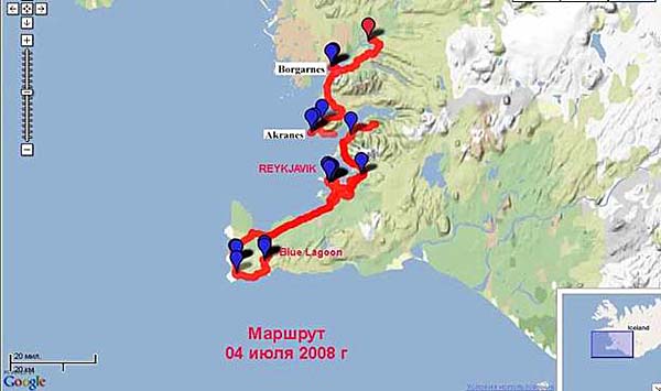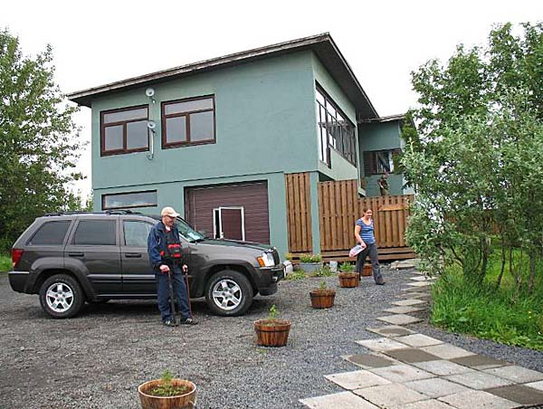 Вылетаем из Москвы (Шереметьево) в 20-00. Вернее, должны были вылететь, но, простояв 40 минут в очереди на взлет, начинаем нервничать – успеем ли мы на пересадку в Копенгагене. Однако все обошлось – и бегом в Копенгагене мы успеваем на самолет, который летит в Исландию. В Кефлавик прилетаем по расписанию, забираем багаж (слава Богу, ничего не потерялось), и нас от JAZZ TOUR встречает русский, живущий в Исландии уже более 15 лет, Алексей, который должен передать нам наш джип «Гранд Чероки». Приехал он в аэропорт на своей машине, и сказал, что повезет нас до Рейкьявика, а там передаст нашу машину. В целом это было бы очень замечательно, если бы мы не встречались около часа с его женой, Еленой, на заправке, стоя с разных сторон от магазинчика и не зная, что машина уже около нас (Елена забыла дома мобильник и созвониться с ней было нельзя). Под сильным ветром и дождем наконец забираем машину, задав только основные вопросы по разным кнопкам (на Чероки никто из нас не ездил), и примерно в 2 часа ночи по местному времени отправляемся в путь. Мы заказали первую ночевку поближе к Гейзеру, поэтому проехать нужно еще около 60 км от Рейкьявика. Почему-то никто из нас не посмотрел, что по дороге у нас перевал через хребет, и это оказалось полной неожиданность. Итак, в полной темноте, под дождем, в плотном тумане, на незнакомой машине, по горной дороге, не успев подключить GPS-ку, Володя ведет машину, включая по очереди, все кнопки (одним из результатов было – открытие люка в крыше, что под дождем оказалось совсем неправильно).