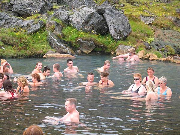 В 11-25 поворачиваем на дорогу № 208 в сторону Ландманналаугара. В 13 -00 мы на месте. Оставляем машину перед бродом, идем к теплому источнику пешком. Полно народу и машин. С огромным удовольствием плещемся в теплой воде, временами, попадая в струи горячей воды. Песок под водой, если в нем немного покопаться, оказывается очень горячим. В общем, полное впечатление (видимо, правильное), что сидишь на крышке кастрюли, в которой что-то вариться. Идти вверх на гору (а там что-то интересное дымит) нет времени. Сразу скажу, что каждый день и в дальнейшем сопровождался одной и той же фразой: «Здесь бы постоять день-два и полазать всюду». Но, увы, поставленная задача — за две недели увидеть всю Исландию — не давала возможности где-нибудь останавливаться надолго.