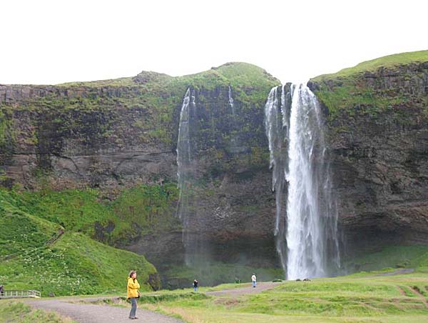 Едем дальше. Обратно возвращаемся по 32 и 30 дороге. Неожиданно появляются зеленые пейзажи: травка, деревья: маленькие березки, елки. В 18-20 мы поворачиваем с 30 дороги налево на дорогу №1 в направлении Hella, Vik. В 18-40 мы в Hella, заходим в магазин. В 19-00 движемся дальше. В 19-45 подъезжаем к водопаду Сельяландсфосс (Seljalandsfoss), который знаменит тем, что под него ведет тропинка, по которой можно оказаться за водопадом. Гуляем, проходим по тропинке. Водопад очень хорошо виден с дороги №1. Расположен примерно в районе примыкания к дороге №1 дорог № 249 и 247.