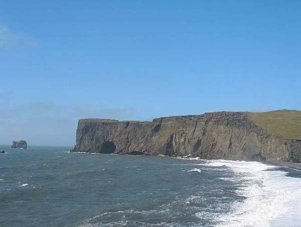 Сказался недостаток точных описаний – поворачивать к океану надо было не доезжая до Вик. Моем ноги в Атлантике, гуляем по черному песку, находим морских звезд, и едем в обратную сторону, где мы видели значок «достопримечательность», который выглядит следующим образом Километрах в 10-15 не доезжая Вик (если ехать от Рейкьявика) есть поворот на 218 дорогу на Dyrholaey, куда и надо сворачивать на обзорную площадку. Долго бродим, любуемся скалами, фотографируем. Заезжаем на маяк, откуда открывается потрясающий вид на Атлантику. Это самая южная точка острова.