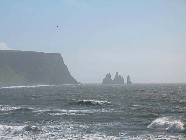 В принципе, на сегодняшний день в наших планах были следующие мероприятия: скалы в Вик, национальный парк в районе ледника Ватнайёкулл (Vatnajokull), — парк Скафтафелл (Skaftafell), лагуна айсбергов (Jokulsarlon) -программа достаточно плотная. В 9-50 выезжаем в сторону дер. Вик. Приехав в Вик в 10-15, мы понимаем, что поворот на обзорную точку на скалы мы, очевидно, проскочили, из самого Вика видно только маленький кусочек скал и большая скала, на которую ведет пешеходная тропка. Но туда мы решаем не лазать.