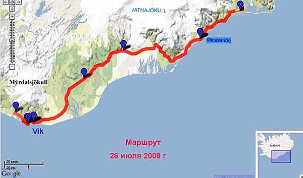 В 14-45 уезжаем обратно. Первоначально, в Москве была идея проехать по 208 дороге до №1, обогнув ледник Myrdalsjokull с востока и выехать восточнее д.Вик. Но здесь, в Исландии, местный гид Елена, которая постоянно возит экскурсии по острову, нам сказала, что эта дорога очень плохая и много серьезных бродов. Поэтому еще с утра было принято решение ехать обратно, тем более, что по дороге №1 между Хволсволюром и Виком много интересного.
