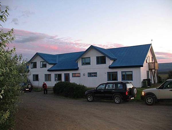 Пытаемся что-нибудь выяснить про ремонт около большого отеля в Бьяркалундуре (Bjakalundur). Машин и народу полно, нам говорят, что мастер — может быть — будет, и может быть посмотрит. Ждем полчаса, ничего не происходит, и мы решаем на свой страх и риск ехать к ферме. На наше счастье нам это удается и в 20-45 мы на ночевке на ферме № 22 Hvitarbakki.