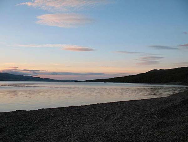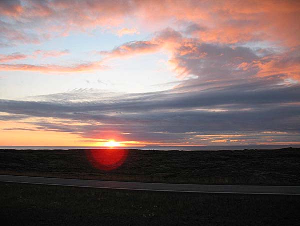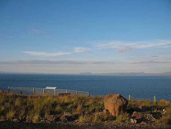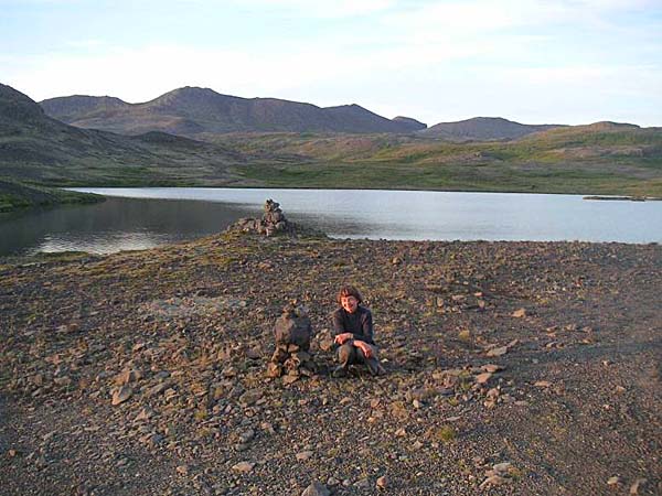 Проезжаем вдоль озера по южной стороне, переезжаем озеро (вернее большой разлив) в его западном окончании и начинаем карабкаться на перевал по очень хорошей асфальтовой дороге. Выбираемся на плато, дорога по-прежнему асфальтовая, но по бокам отходят грунтовки, по которым ездят здоровенные грузовики, видны какие-то непонятные промышленные работы. В общем, через некоторое время я взбунтовалась и сказала, что дальше ехать не хочу и мне здесь все не нравиться, да и время уже довольно позднее. После недолгих споров поворачиваем обратно. Уже в Москве, рассматривая карту достопримечательностей Исландии, обнаруживаю, что эта дорога должна вести в места, где водятся олени, должно быть в конце есть какая-то база. Спустившись к озеру, разводим примус, ужинаем, хотим позвать чудище, но понимаем, что забыли, как его зовут. Возвращаемся в гостиницу, наездив еще 49 км.