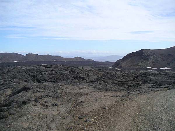 Приблизительно около 13-00 мы доезжаем до дороги № 88, которая налево ведет к кальдере, а направо идет на север к дороге №1. Едем к кальдере. В 13-40 мы подъезжаем к базовому лагерю, который стоит около вулкана. Похоже, что там живут как туристы, так и геодезисты, наблюдающие за вулканом. Кругом многокилометровые поля застывшей лавы. Невозможно даже вообразить, что тут должно было твориться во время извержения. Описать наши впечатления словами я не могу. Самое сильное известное извержение здесь произошло в 1875 году, когда за несколько часов извержения были залиты многокилометровые площади.