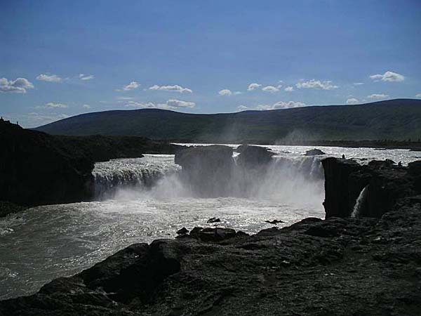 Дымиться и весь склон над этим полем. Немного погуляв, едем на ночевку. В этот раз мы ночуем не на ферме, а в гестхаусе, что оказалось очень кстати, так как мы все в пыли от этих дороги. Душ, расположенный прямо в номере очень не помешает. В 22 часа, подъехав к гестхаусу Fossholl (№403), мы с восторгом обнаруживаем, что он стоит прямо на берегу речки с водопадом Годофосс.(Godafoss). Приятное окончание такого напряженного дня. Гуляем к водопаду, но не с самой выгодной стороны. Решаем, что как следует посмотрим на него, когда двинемся дальше на запад.