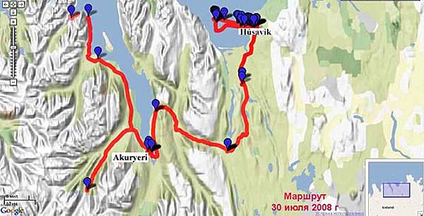 В 14-50 отправляемся в направлении к северной столице Исландии – Акурейри. (Akuryeri) по дороге № 1. Не доезжая до Акурейри в 15-30 – 16-05 — купание в Северном Ледовитом океане (Гренландское море мы общим решением нашей группы отменили). Вообще-то, на самом деле это был фьорд (EYJAFJORDUR).