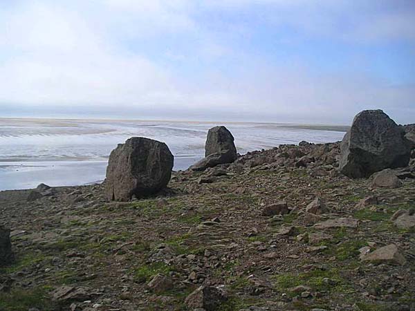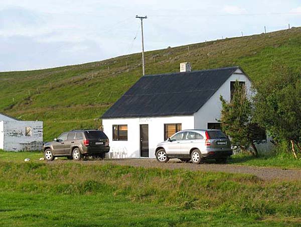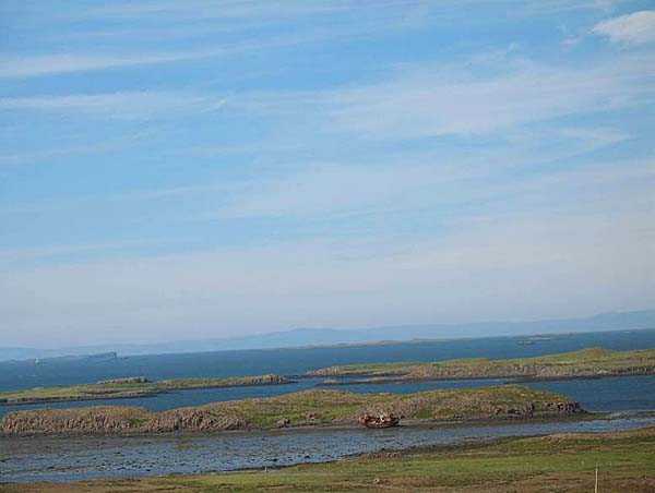 С 9-00 до 12-30 идем на пароме через Брейдафьорд (Breiðafjorður). Машины забиты в паром как сельди в бочку. Люди гуляют по палубам, в баре едят и пьют. Погода прекрасная, тепло, ветра (к величайшему огорчению Андрея) нет. Заходим на островок Flatey, высаживаем любителей наблюдать за птицами, которых здесь действительно полным-полно и в 12-30 мы снова на суше в Бранслаекюре (Brjansðkur), который на поверку оказался просто пристанью с несколькими домишками рядом. Наша уверенность, что нам удастся залатать здесь колесо, да еще в субботу, резко падает. Решаем ехать на ферму и попытаться выяснить там, где можно залатать запаску. Без запаски ехать по горным дорогам как-то не очень уютно.
