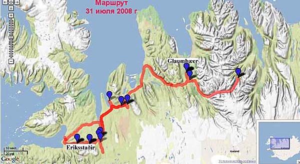 В 15 часов выезжаем от водопада и, чтобы проверить себя, машину, да и посмотреть немножко дорогу в центр острова, решаем съездить вглубь острова по дороге №35 . Эта дорога соединяет север и юг острова, но в большей части она грунтовая и здесь рекомендуются машины 4х4. Заезжаем, насколько хватило времени наверх, так что становиться видно два ледника по обе стороны от дороги (слева Лангьёкулл(Langjokull), справа — Хофсьёкулл (Hofsjokull. Заехали мы по этой дороге ориентировочно километров 15-20 за озеро Хвитарватн (Hvitarvatn). Посмотрели на ледники, поехали обратно, на обратной дороге свернули скорее всего на дорогу № 335 (хотя здесь полной уверенности в номере дороги нет), чтобы подъехать поближе к леднику Лангьёкулл. Ледник был уже достаточно близко, когда мы наткнулись на переправу, через которую решили в первый день не рисковать переезжать, тем более, что особенной необходимости в этом не было. Окончание горной экскурсии в 19-40. Двигаться на ночевку решаем по дороге №30, чтобы не давать крюк и не ездить по одним и тем же местам. Выезжаем на дорогу №1, вечером заправляемся в городке Хволсволюр ( Hvolsvollur) . Сворачиваем на ферму на дорогу № 261, проезжаем по ней примерно 13 км и мы на ферме в Fljotsdalur (ферма №650).