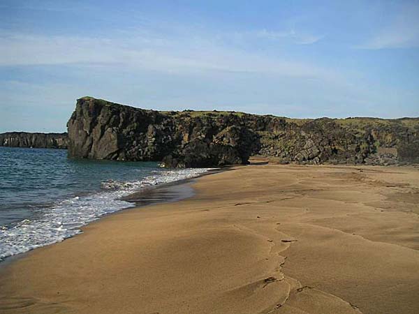 Едем по 62-й, сворачиваем на 612, от нее отворотка на 613 – к бухте с белым пескам. (Rauðasandur). В 14-10 спускаемся к бухте. Честно говоря, место любопытное, но особого впечатления на нас не произвело. Пожалуй, гораздо интереснее сама дорога, спускающаяся к бухте – настоящий горный серпантин, грунтовка.