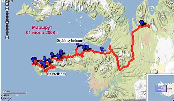 Решаем сегодня заскочить в порт в Стиккисхолмюре (Stykkisholmur) выяснить все про завтрашний паром. Меняем в кассе ваучеры на билеты на завтра, смотрим как происходит погрузка сегодня. Совершенно ясно, что ехать завтра с утра надо пораньше. В 16-15 выезжаем к нашей ферме и в 17-45 мы уже на ферме №141 с названием Suður-Bar. Очень красивое место с видом на залив Атлантики. Быстро заселившись, выезжаем к западу полуострова в сторону вулкана, покрытого ледником Снэфельдсйокулл (Snðfellsjokull).