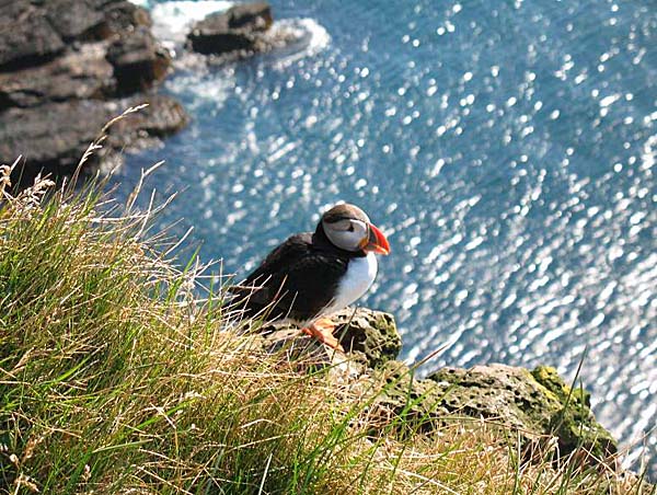 На утесах полно разных птиц: чайки и тупики. Тупики — совершенно наглые, подойти к ним можно совсем рядом. Чайки орут так, что заглушают все остальные звуки. Долго гуляем, но до самой верхней точки не пошли.