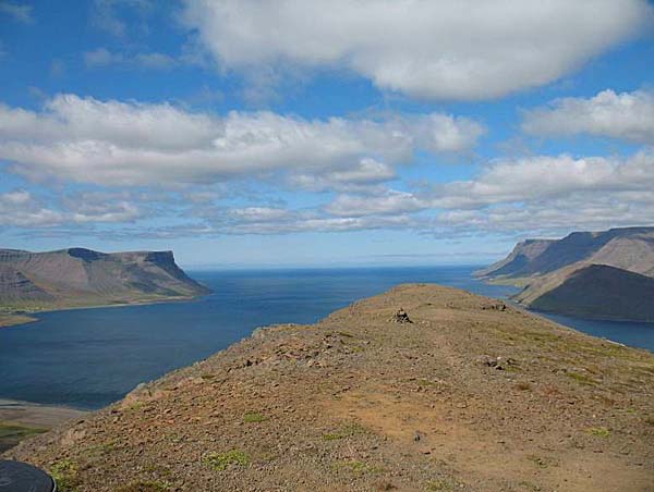 Все склоны в чернике. Далее едем по фьордам и любуемся видами. (Arnarffjorður с несколькими мелкими фьордами внутри, и через перевал – Dyraffjorður ) Заканчиваем вояж по фьордам в маленьком городке ðingeri (Тингери)на берегу Dyraffjorður. Маленький городок, небольшой порт. Заправляем машину. И в обратный путь. Около городка невероятно крутая дорога без номера на обзорную точку. Как мы потом поняли, страшно рискуя остаться опять без колес, едем на обзорную точку.