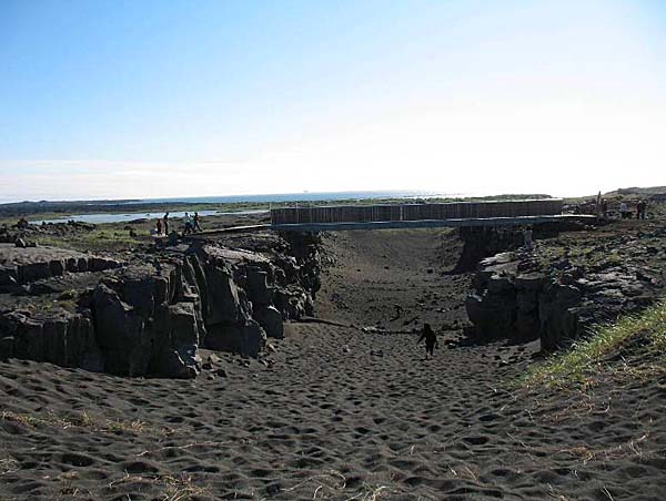 В 12 часов подъезжаем к мосту через большую речку, на мосту ворота, которые надо открыть, проехать и закрыть за собой. Въезжаем в район междуречья (между двумя реками, текущими с ледника, сливающимися к северу в одну Jokulsa a Fjollum, на которой и находятся знаменитые водопады Исландии Детифосс и др.). Описать эти места очень сложно: между огромными мрачными полями почти черной лавы петляет и вьется дорога, посыпанная мелкой светлой пемзой. Ощущение какой-то полной нереальности происходящего.