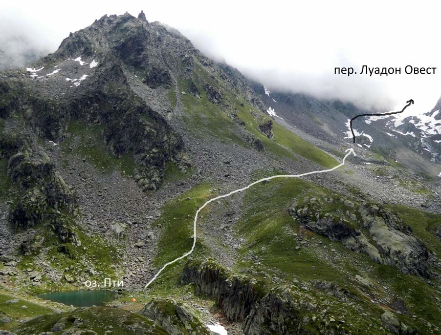 Пер. ЛуадонОвест можно считать в определенном смысле первопрохождением, т.к. сведений о посещении его отечествеными туристами мы не нашли. Впрочем, взошли мы на него мы в рамках радиального выхода с запада, а восточный склон (ведущий на л.Рутор) из-за сильного тумана просмотреть не удалось.