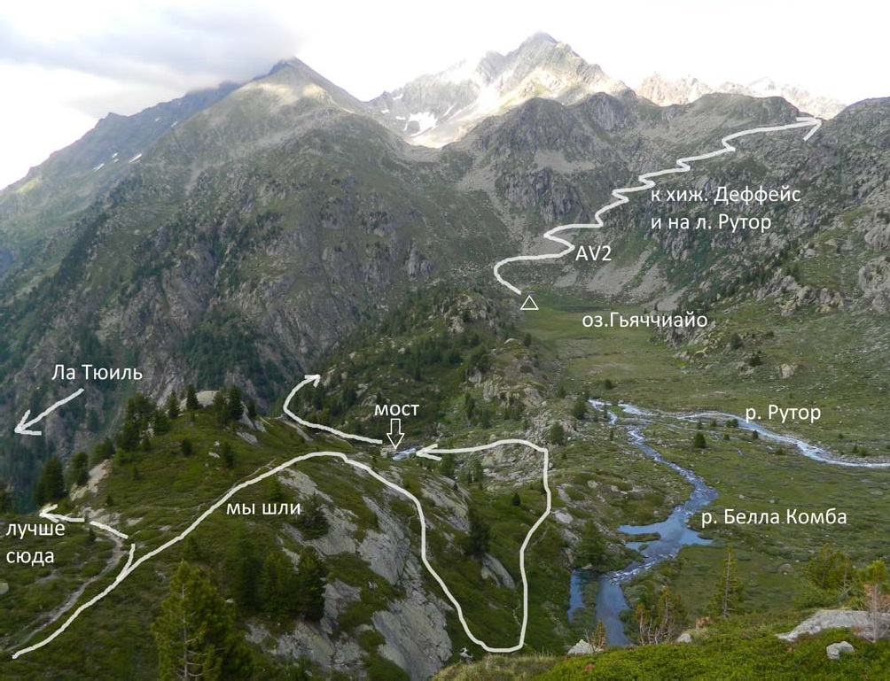 Спустились к мосту (25 мин) (при этом решили срезать, но как это обычно бывает, тропа потерялась; лучше идти левее по основной тропе как показано на фото 25), перешли на правый берег р. Рутор и по лесной тропе вышли на AV2 (10 мин). По ней немного поднялись (15мин) к озеру Гьяччайо (или Lago Glacier), находящемуся в северной части вышеупомянутой зелёной котловины. Рядом – добротный домик с замком на двери.Поскольку кончался световой день и начинался дождь, остались на ночевку в этом месте (по плану должны были подняться к озёрам под ледник).