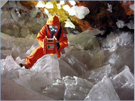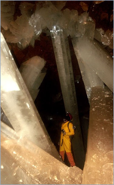 В пещере насчитывается 162 гигантских крристалла. Самый большой 11,4 метра. Сложность в исследовании этой пещеры заключалась в большой температуре 60 градусов по цельсию при очень большой влажности. Это вызвано термальными водами поднимающимися из глубин земли, в которых и формировались эти кристаллы. Находится в такой атмосфере без специального снаряжения возможно не более 2-х минут.