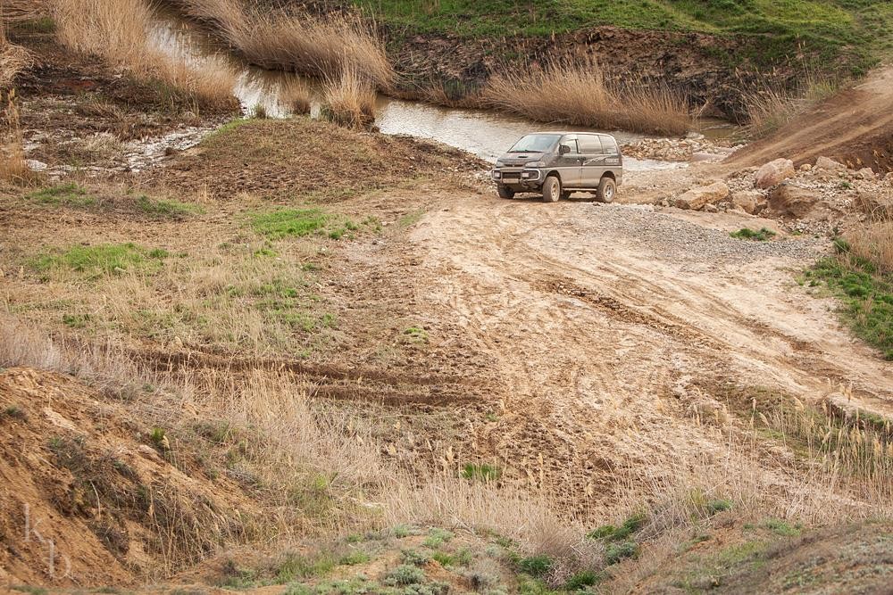 По пути Гилса выкинуло с дороги.. Выкинуло не совсем и довольно поправимо. Нужно для этого было только нагрузить левый борт — и он сам дальше поехал. Пока наши доблестные и немаленькие мальчики тащили делику, погнули ей порог. Бедная многострадальная делика вогнула порог обратно — и мы поехали дальше почти без потерь.
