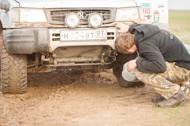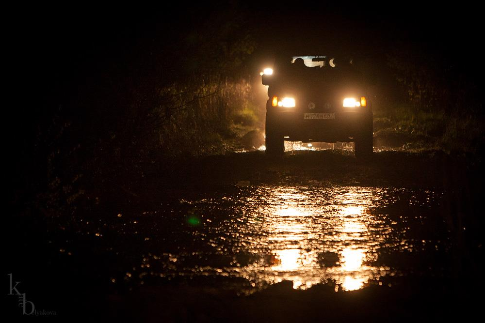 Дорога при этом совсем уж ровной не выглядела – кое-где попадались громадные лужи, кое-где было очень скользко после того же дождя, а где-то даже существовали миниобъезды особо глубоких луж. Гриша объездами не пользовался, с разбегу прыгая во все лужи, какие были. Нам внутри было весело, а Димка в рацию после очередной лужи прогудел «Что, Гриш, нашел отличный объезд прямой дороги??». В итоге до самого последнего дня поездки эту фразу мы вспоминали по десяток раз на дню.