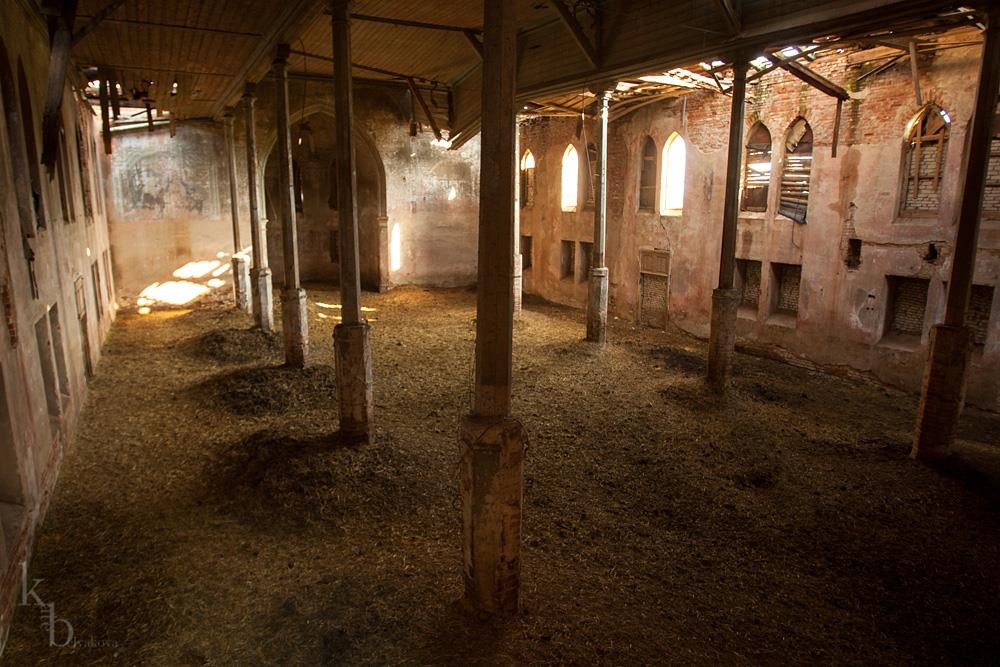 Развалины кирхи стоят на невысоком холме, невдалеке пасутся стада.. Храм чудом не развалился совсем и до сих пор его стены внушают уважение своим внешним видом. Внутрь храма попасть не удалось, но заглянуть туда нам посчастливилось. В том месте, где должна была быть колокольня, сохранился один пролет лестницы, а с нее открывался вид внутрь. Оказалось, что внутри до сих пор держат скот. И в сочетании с наваленным сеном колонны и стрельчатые окна вызывали странные смешанные чувства. Мы тут же окрестили кирху холи- коровником и поехали дальше..