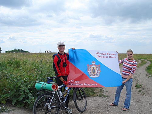Окрестности села Старая Рязань (Спасский район, Рязанская область). На городище древней столицы Рязанского княжества. Начало велопутешествия. Вместе с добровольной помощницей развёрнут флаг путешествия. В декабре 1237 года, первым из столичных городов княжеств Древней Руси, в результате пятидневной осады, город был полностью сожжён войсками хана Батыя. Все его защитники и мирные жители погибли.