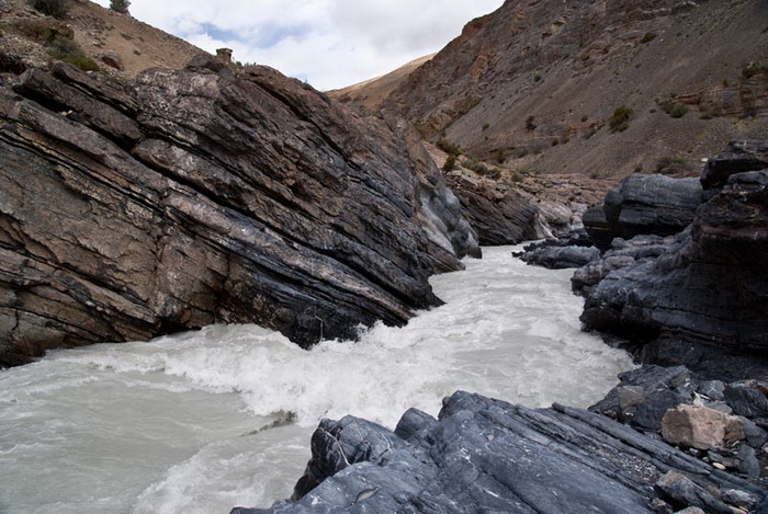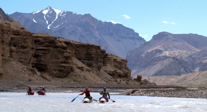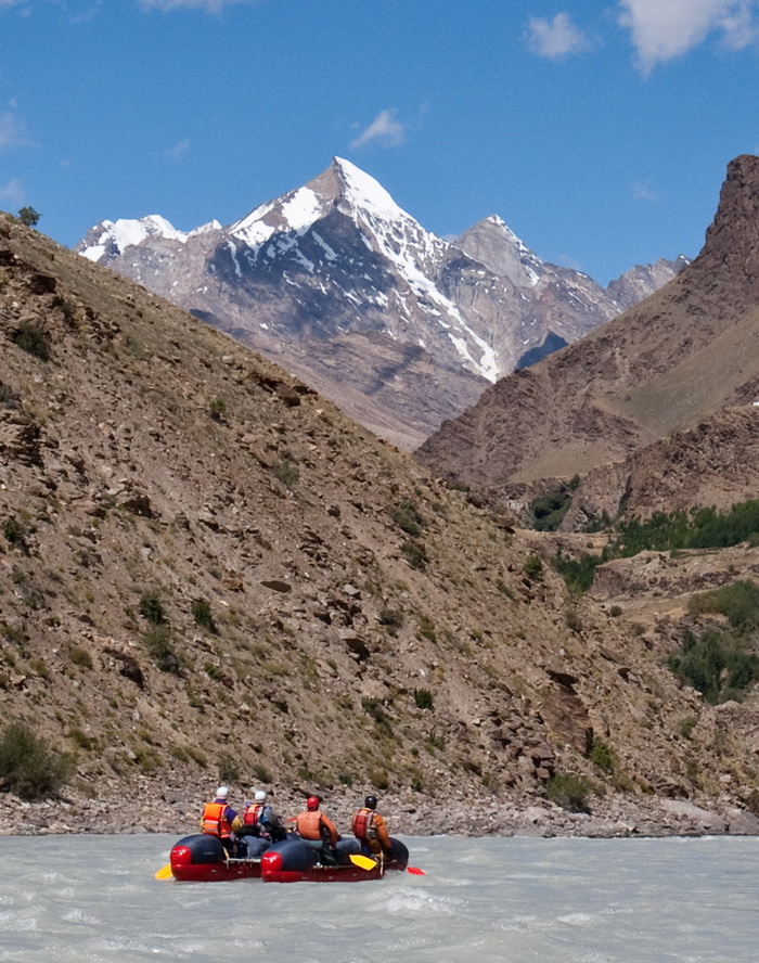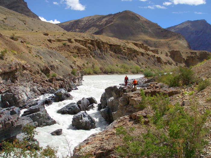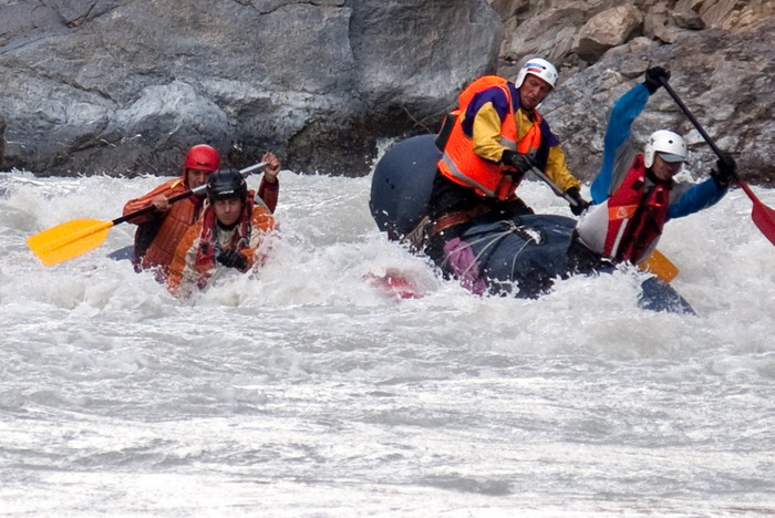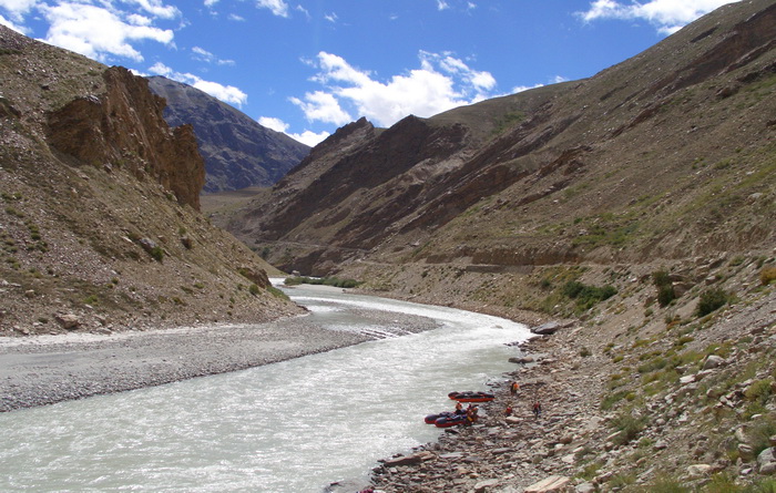 К 13.00 стапель окончен. Спустили на воду и без лишних фанфар, на которые нет сил, оттолкнулись от берега. Все-таки плыть намного легче, чем ходить по берегу. Поначалу продолжались небольшие разбои, но после того как трасса Манали-Лех ушла направо в сторону на перевал, река вошла в одно русло и сплав стал пободрее. В основном преобладали шиверы плюс несколько порожков, условно тянущих на 3-4. Все читается сходу, идти легко. Вода имеет белый цвет, мутный, какой-то меловой осадок. Угольный фильтр со свистом пропускает сквозь себя эту белену, не очищая от взвеси. Только катадин фильтрует все по-честному.