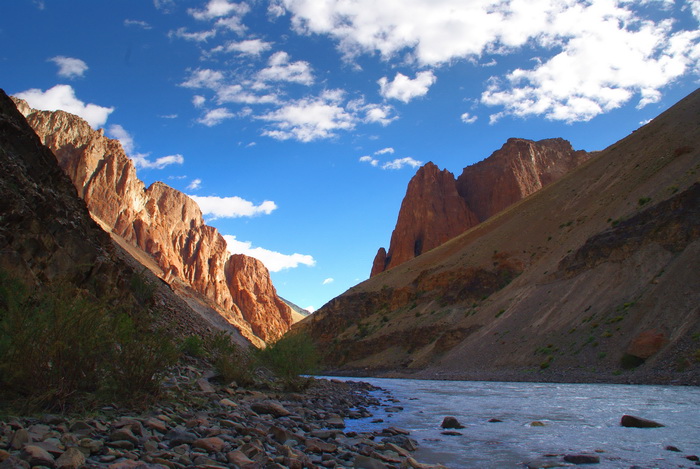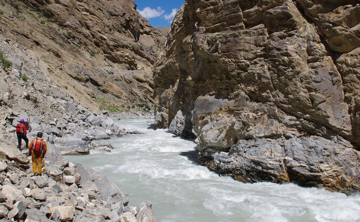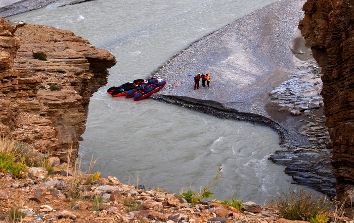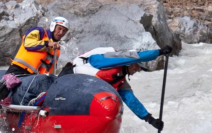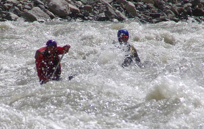 Весь день 9 сентября был насыщен береговыми работами – Тсарап Чу небольшая река, текущая в узких каньонах. Надо отметить, что расход возрос до 50 кубов, поэтому прижимы и прочие прелести уже представляли угрозу для четверок, тем более для двойки, на которой шли мы с Лехой.
