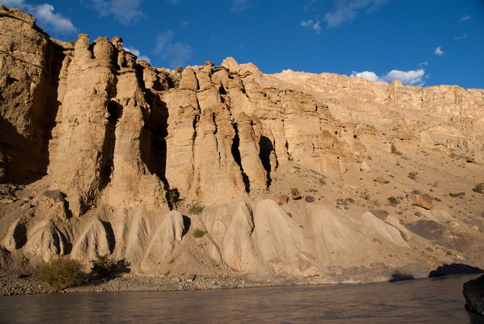 После обеда тронулись в дальнейший путь. Сразу после монастыря река входит в очередной каньон. Пошли пятерочные порожки среди «троллейбусов», требующие осмотра и страховки. Так продолжалось приблизительно до 16.00. Солнце скрылось за высокими стенами каньона. Подул сильный ветер, стало жутко прохладно. Решили не перенасыщать день — встали на первом попавшемся галечнике перед следующим длинным препятствием. Дрова есть, но их немного. Из-за ветра тяжело ставить палатки, обкладываем «юбки» палаток камнями. Тропа проходит на другом берегу, поэтому нас никто не беспокоит. Стали появляться конные, значит тропа в отличном состоянии.