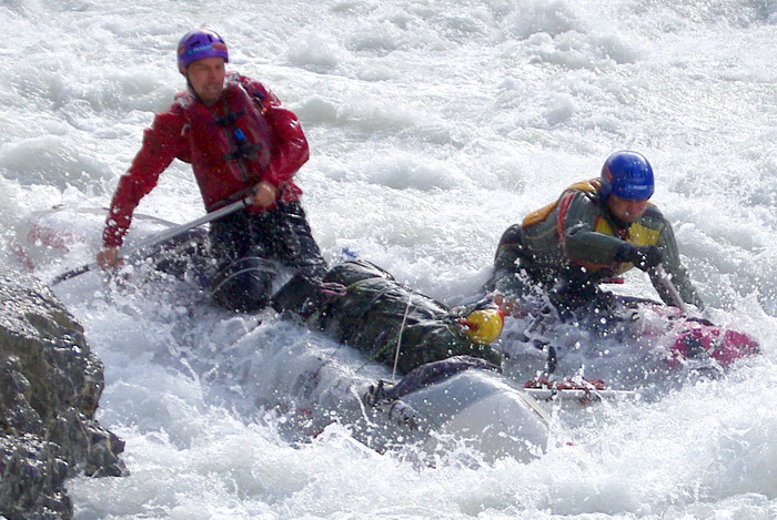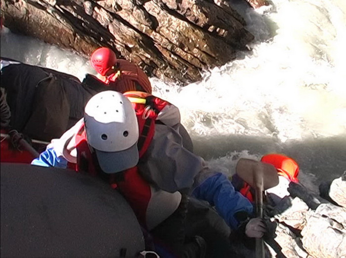 Со стартом тоже возникли сложности, поскольку стартового места не было вообще. Скала обрывалась трехметровым обрывом, внизу которого бушевал поток, стараясь вовлечь судно в прижим под камень.