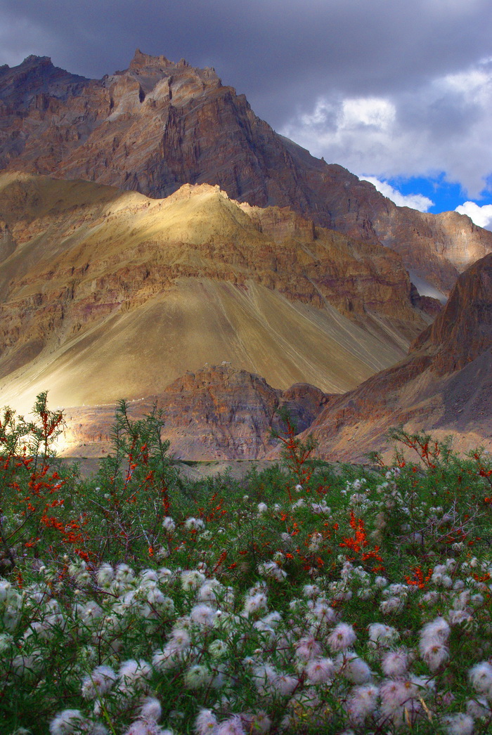 Единственное, что меня поразило — это высота, на которой выстроен монастырь и вид, открывающийся со стен. Очень красиво и величественно. Как средневековый замок! Но в отличие от замков, эта крепость вряд ли выдержала бы серьезную осаду. Стены и все-все- все сложено из смеси глины и веток. Учитывая глобальное изменение климата в Ладакхе, можно ожидать, что любой более-менее приличный ливень запросто может смыть полдеревни.