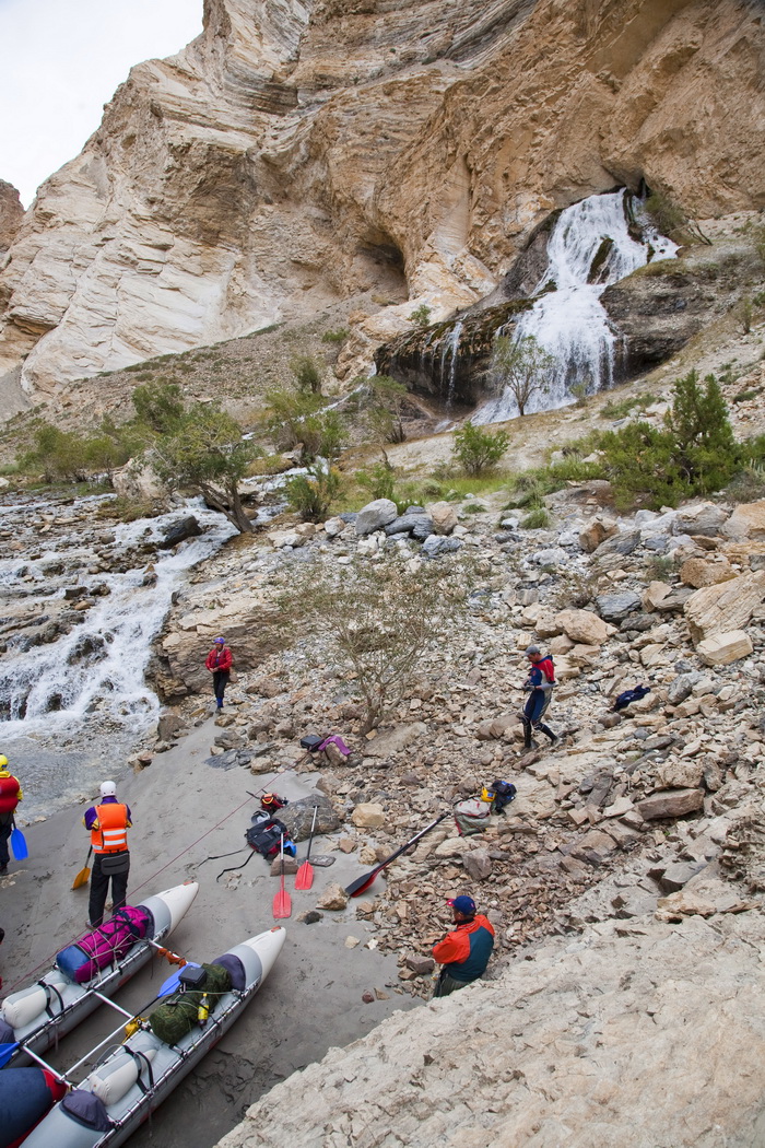 Весь день мы наслаждались видами Занскарского каньона вперемежку с прохождением несложных порожков. Запомнился очень красивый водопад на ПБ, жаль только, что около него негде ночевать и нет дров, иначе он бы мог стать «хитовым местом» всего путешествия по каньону Занскара.