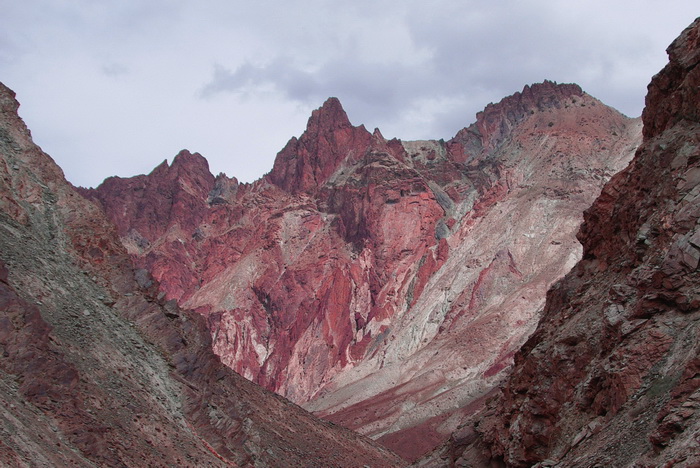 Еще, кроме впечатляющих видов, нас поразило разнообразие оттенков и цветов каньона. Вчера большую часть дня декорации вокруг нас были теплых оранжевых и бежевых тонов с красивыми вкраплениями зеленого камня. Сегодня в первой половине дня порода окружающих скал была красно-бордовых цветов. А после обеда начались глубокие сиреневые цвета как на картинах Рериха. На других реках тоже случается встретить явно выраженные цветные скалы, но здесь!!! На Занскаре если уж «цвет» — то он от воды и до самых оконечностей горных пиков, поэтому смотрится очень монументально.