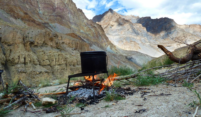 Предвкушая вкусный ужин, решили больше сегодня не идти и встали на галечнике в 5 километрах от начала знаменитого Занскарского каньона.