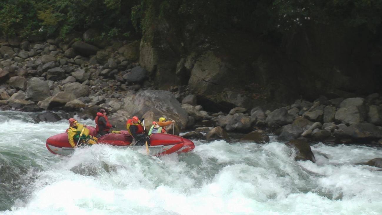 Порог 37 (5С): Гряда камней перегораживает все русло при его ширине метров 50, большой перепад; Нагромождение камней как бы разбивает русло на правую и левую часть. Правая часть реки забита камнями, не оставляя проходов. Основная масса воды идет в левую протоку, образуя крутую мощную горку, более чистую в правой части Ф.55. Заход в горку затруднен обилием надводных камней в русле, необходимо с берега точно наметить нужные ворота. Проходили поочередно, К-2, К-1, К-3. После прохождения лучше зачалиться на каменный островок справа, откуда можно просмотреть следующий перепад.Дальше ущелье резко расширяется, характер реки резко меняется. В ста метрах ниже все русло перегораживает гряда камней, виден большой перепад. Чалка и просмотр возможны по обоим берегам, но с ЛБ картина следующего препятствия открывается более полно. Чалиться по ЛБ следует в непосредственной близости от порога, поскольку из первого улова пройти вдоль берега проблематично. К-2 и К-3 зачалились под ПБ берегом, но основной проход им виден был плохо и К-1 по рации с ЛБ откорректировал им линию движения.