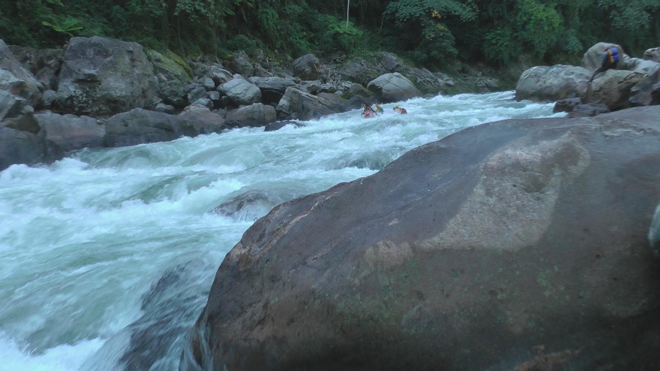 Порог 34 (6А) «Паспорт»: Назван так потому, что уже после прохождения его частью группы, выяснилось, что Жук забыл на стоянке свой паспорт и покарабкался за ним обратно по джунглям. Остальная группа в это время обрабатывала следующий порог. Очень мощный, длиной ~ 100 метров. На заходе узкий, концентрированный слив в центре русла, просмотреть его досконально мешают береговые камни, но более проносным он выглядит ближе к левому камню, которым он образован. Далее идет ряд мощных бочек, и на выходе крутая горка, разделенная на две трети продольной грядой камней. Основная струя идет в правую часть русла. Идти можно как справа, так и слева. После первого просмотра, нам показалось, что идти лучше слева, поэтому К-1, отработав первый слив и прошив бочки за ним, уходил что есть силы перед грядой камней в левую часть русла. Но снизу уже было видно, что и правая часть горки отлично идется, и идущий за ним К-3, уже съезжал в правой части горки, дабы избежать лишнего маневра. Все части порога очень мощные. Ф.47-49