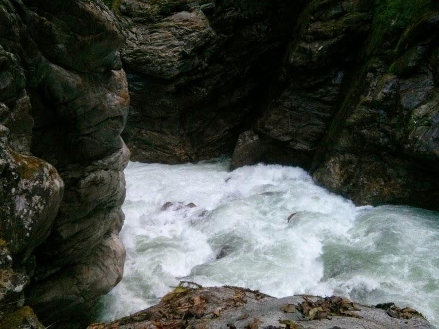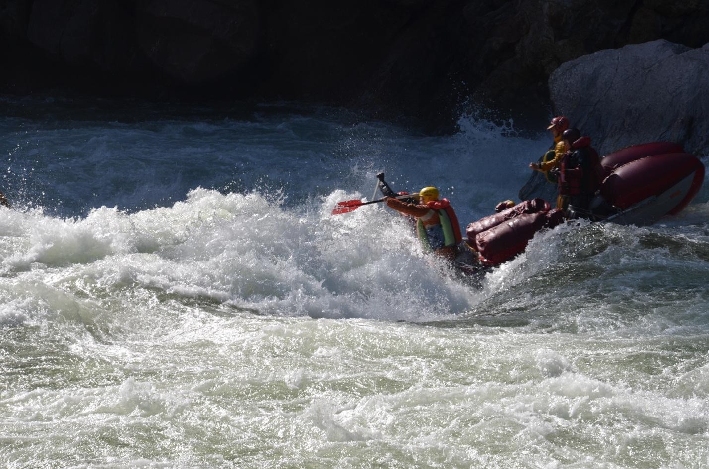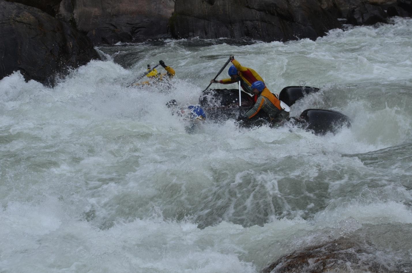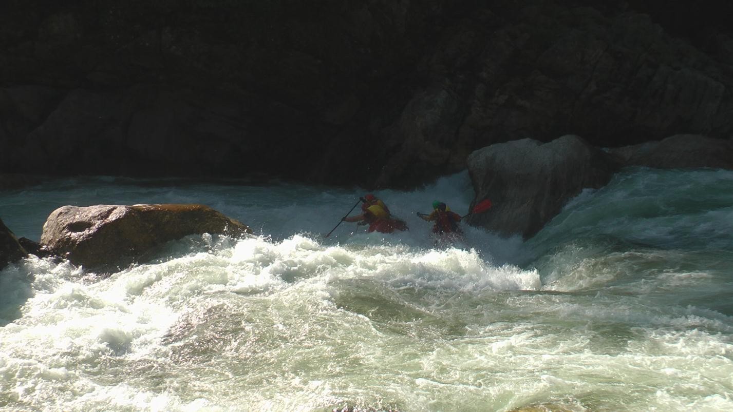 Среди прочих мы смогли выделить Порог «Свагат» (5С-6А), практически повторяющий по нашей воде порог «Трамплин в небо», с тем отличием, что по правой части русла удается без особых проблем объехать обломок скалы в центре русла, который и образует вышеуказанный трамплин с какой-то гомерических размеров бочкой за ним. Порог находится после локального левого поворота, на прямом участке реки; впереди видна высокая скала левого берега. Стоит учесть, однако, что основная масса воды как раз и валит по центру прямо на трамплин. Беглый осмотр тремя участниками по ЛБ. Прошли тандемами, придерживаясь ПБ, постоянно держа носы в берег и отрабатывая от того, чтобы не свалиться в центр.