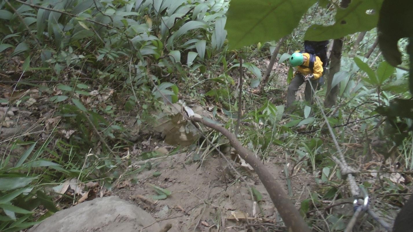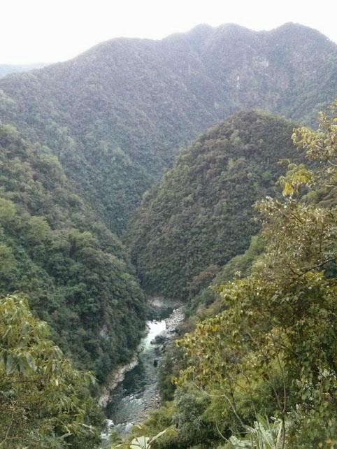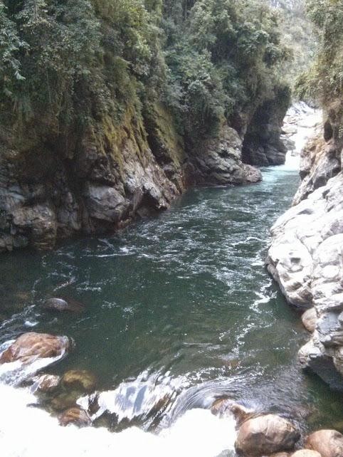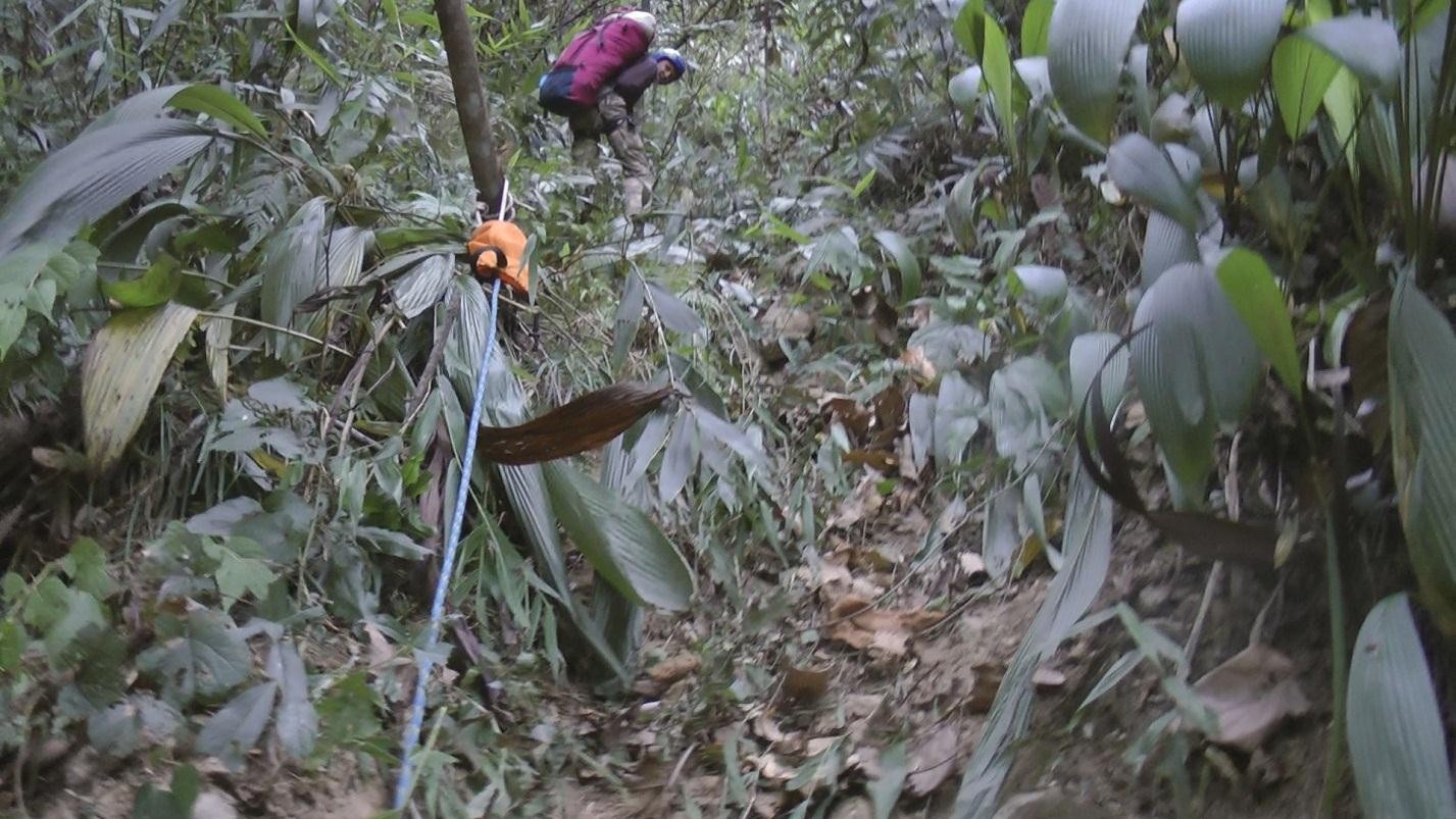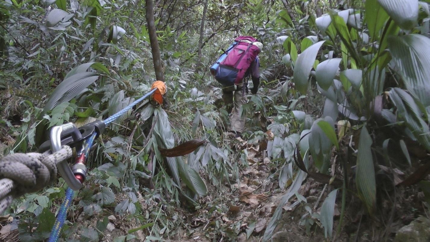 В 6-30 утра вышли на разведку участка реки, называемого «Прыжок мыши», так называемая полуторакилометровая Петля, которая делает река на карте, и где она течет в отвесных скальных стенках. В лагере осталось трое человек. Для разведки взяли с собой почти все горное снаряжение. Опять переправа через мостик, за ним хорошо набитая тропа поднимается круто вверх и через двадцать пять минут (налегке) поднимается на дорогу в маленькую деревушку Punli. Эта тропа – последнее место до петли, по которой можно без проблем и с наименьшими трудозатратами выбраться на дорогу.