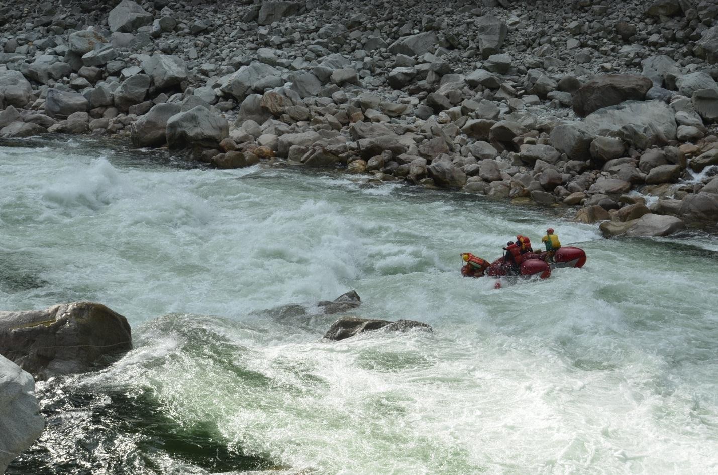 Порог 39 «Намаскар» (5В): Сразу на слиянии и еще метров 150 после. Отдельные камни в русле, русло широкое, линия движения читается с воды. Прошли тандемами после беглого осмотра, придерживаясь правой части русла. Встречаются отдельные ощутимые бочки.