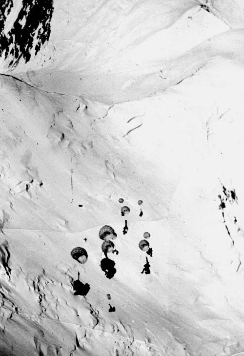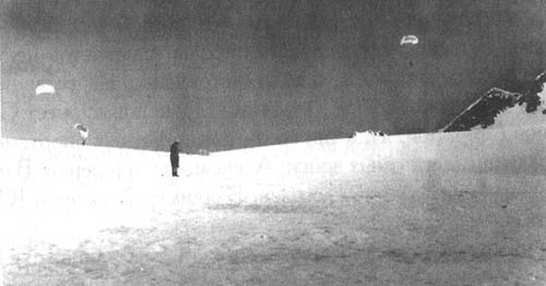 Итак, как и планировалось, три дюжины бойцов в три захода десантировались на небольшую площадку на высоте 6100 метров — у самого пика Ленина, а пять более опытных десантников и пять испытателей из НИИ ПДС прыгали на саму вершину — на отметку 7100.