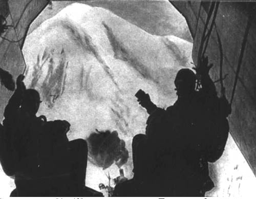 А тем временем «Ан-12» кружился над горой. Появились облака и легкий ветер. Чтобы мишень — букву «Т» из оранжевого полотнища — не унесло, на нее всем телом налег Николай Черный. Постоянно зажигали дымовые шашки. По дыму штурман мог определить направление и силу ветра. Подумали, что десантники решили не прыгать, ведь метеоусловия ухудшились, и перенести прыжок на другой день было бы самым правильным решением. Из буквы «Т» сделали крест — запрещающий знак. Часть альпинистов пошла с вершины вниз. И вдруг около трех часов десятка прыгнула. Самолет поднялся на 8000 м. Вспыхнула сигнальная лампа, створки раскрылись, эскалатор пошел.