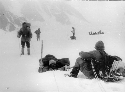 Мы сделали пещеры на высоте 6400 примерно там, где погибли казахские альпинисты – 6200 – 6400. А потом, всё определилось, конечно, на Военных топографах. Там всё стало, что на траверс пойдут – первым Божуков, потому что он вытягивал верёвку на 30 метров от Белопухова, Богачёва, Ерохина. Менять его уже не надо было, даже хотя и по снегу у меня было очень хорошее состояние; тот же самый Белопухов, потому что без него себя Ерохин, видимо, и не мыслил; Богачёв, который зарекомендовал себя так, что вот идёт наравне с Ерохиным.