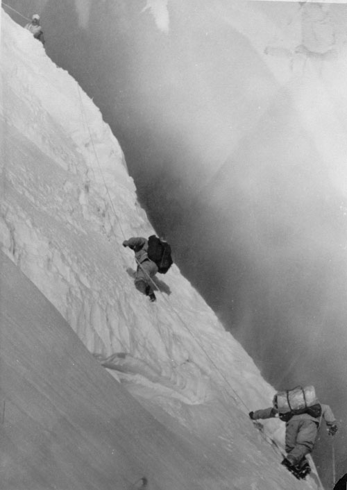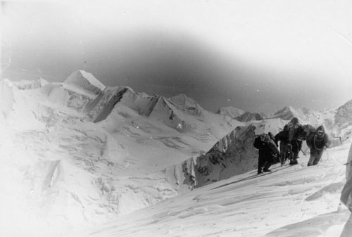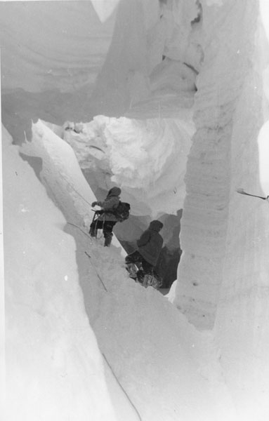 Это был 57-й год. Причём на восхождении, вот у Абалакова была команда, я не помню, там 11, что ли, человек. Ерохин точно такую же команду сделал, всё одинаково. Взяли описание, точное описание, и мы этот маршрут прошли. Абалакова, я сейчас уж не помню, но они этот маршрут прошли за 5 или за 6 дней. Мы с одной ночёвкой прошли.
