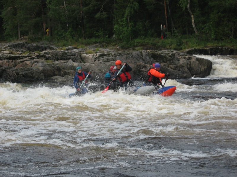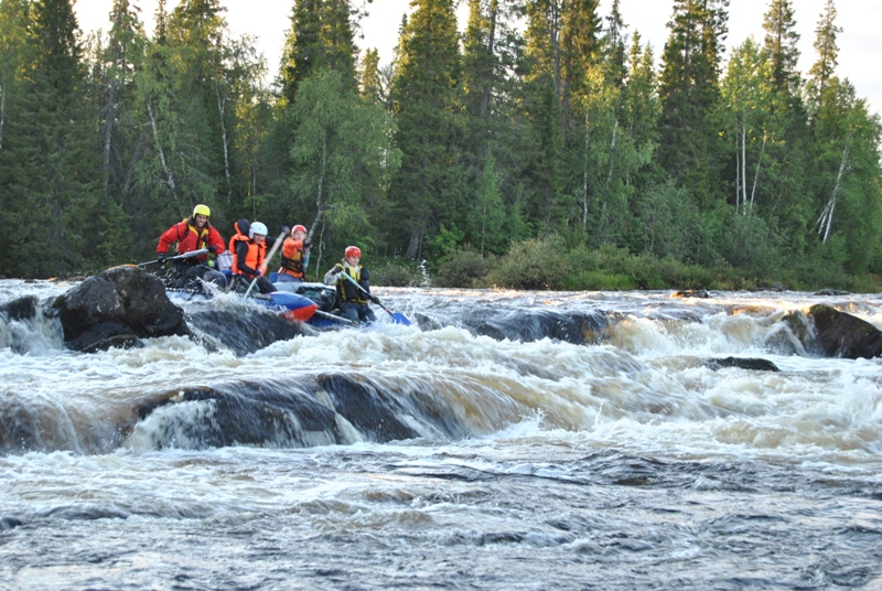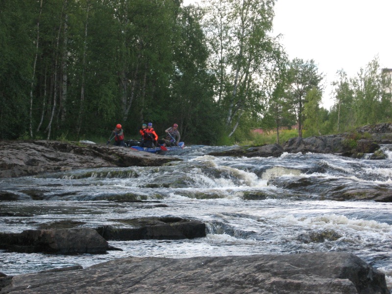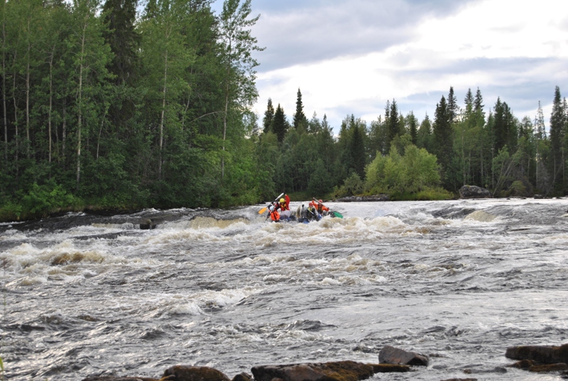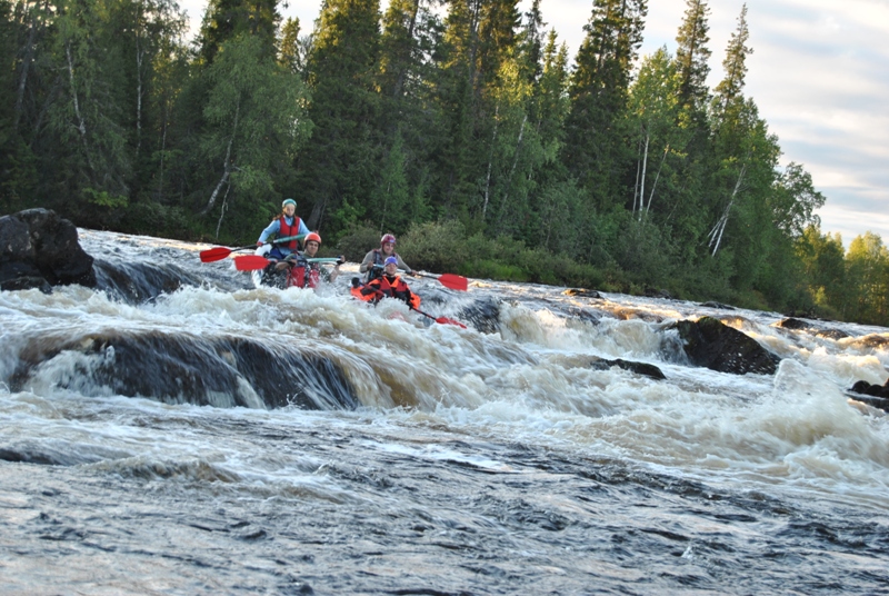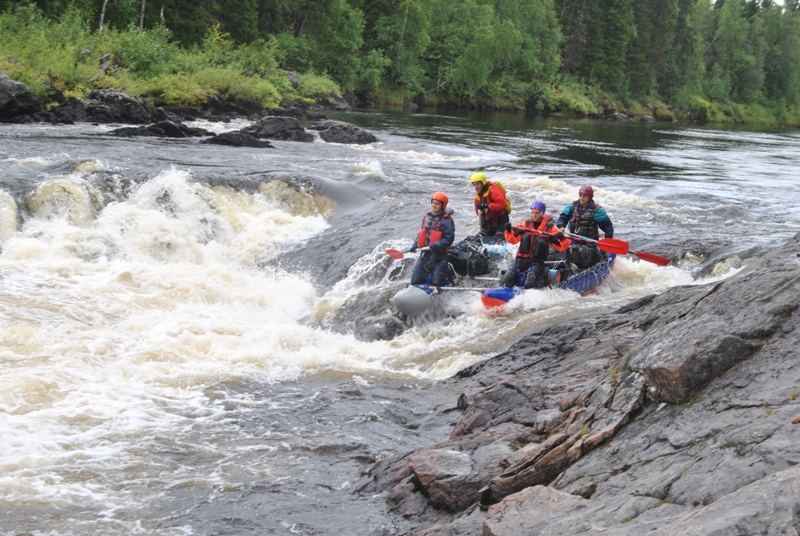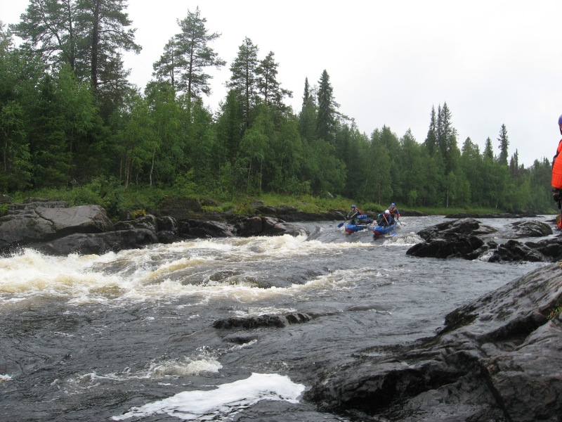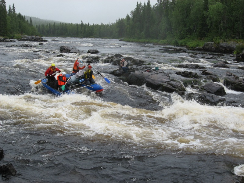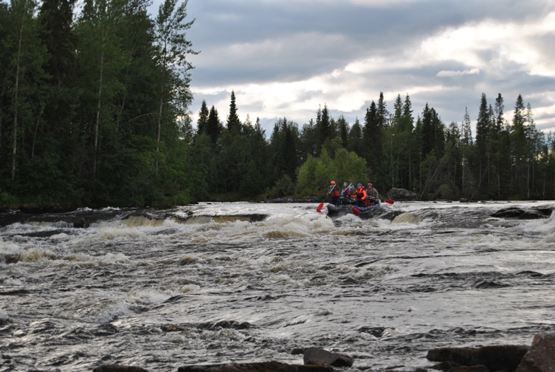 К 20.30 подошли к пор. «Кривой». План на день по прохождению маршрута был выполнен, группа ушла от потенциально-опасного в плане воровства личных и прочих вещей пос. Аллакурти, и необходимо было искать место отдыха и ночлега. Но все стоянки, описанные в лоции Афанасенкова, оказались заняты. Принято решение проходить порог и искать стоянку ниже по течению. Осмотрев порог с ЛБ и наметив линию движения, решили, что первым пойдет К4-1, зачалится за основным сливом в улове ПБ, выставит страховку спассконцами и съемку, далее к прохождению приступят каяк и остальные катамараны, что и было выполнено без отступлений от плана.