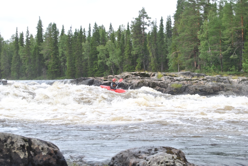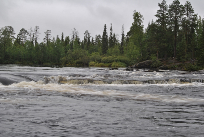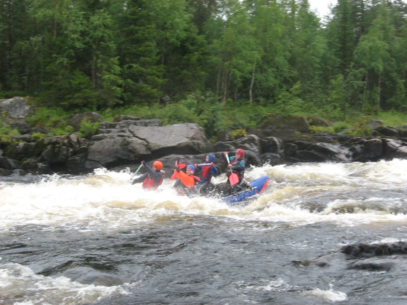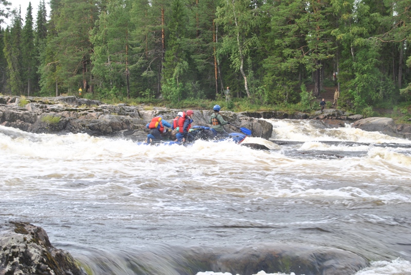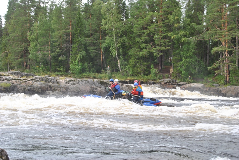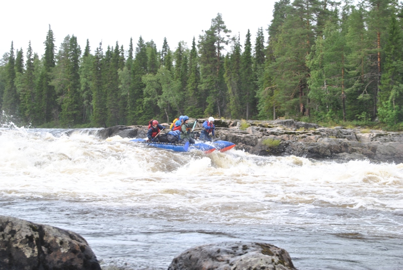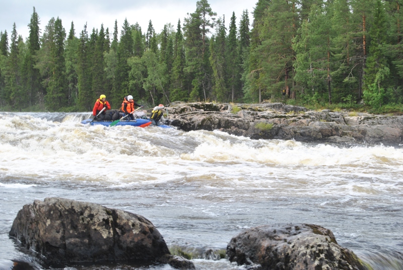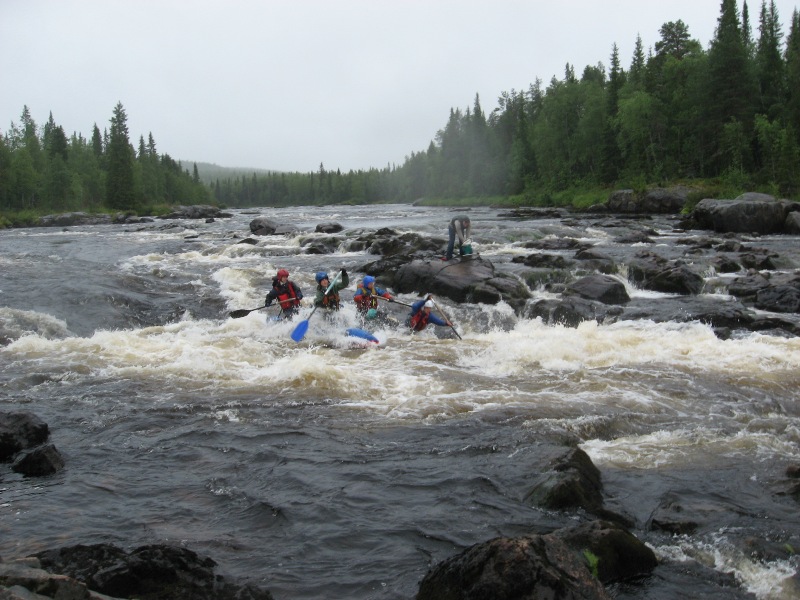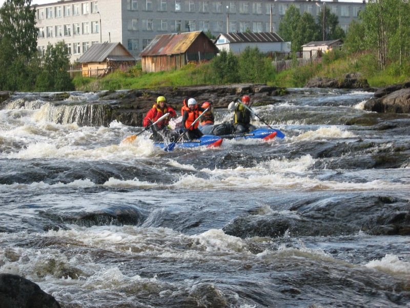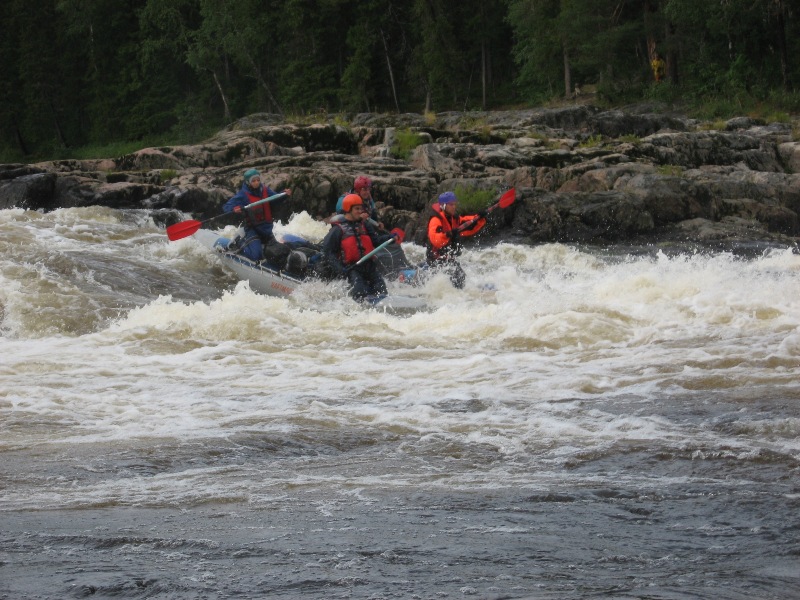 К 20.30 подошли к пор. «Кривой». План на день по прохождению маршрута был выполнен, группа ушла от потенциально-опасного в плане воровства личных и прочих вещей пос. Аллакурти, и необходимо было искать место отдыха и ночлега. Но все стоянки, описанные в лоции Афанасенкова, оказались заняты. Принято решение проходить порог и искать стоянку ниже по течению. Осмотрев порог с ЛБ и наметив линию движения, решили, что первым пойдет К4-1, зачалится за основным сливом в улове ПБ, выставит страховку спассконцами и съемку, далее к прохождению приступят каяк и остальные катамараны, что и было выполнено без отступлений от плана.